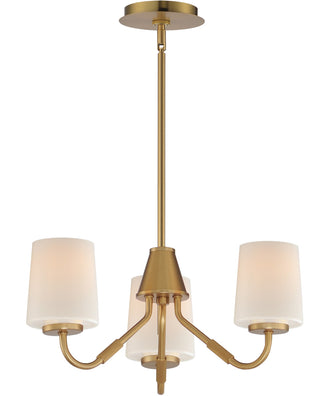 The chandelier boasts a sleek and contemporary design with three gracefully curved arms that extend from a central hub. Each arm holds a white glass shade, which diffuses light beautifully, creating a soft and ambient illumination. The combination of the natural aged brass finish and the white glass shades offers a striking contrast that enhances the chandelier's visual appeal. The minimalist yet elegant design ensures that this chandelier will seamlessly blend into both modern and traditional settings.