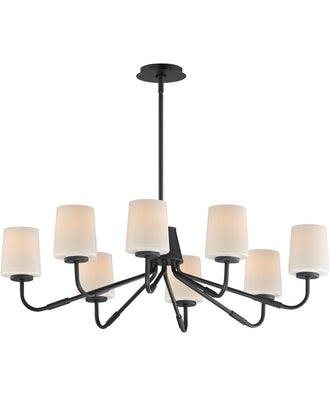 The Durham 8-Light Chandelier in Black is a striking addition to any home, blending modern industrial design with timeless elegance. This chandelier features knurled rod details that add a touch of sophistication and texture, making it a perfect centerpiece for various interior styles. The matte black finish exudes a contemporary vibe, while the white glass shades provide a soft, diffused light that creates a warm and inviting atmosphere.