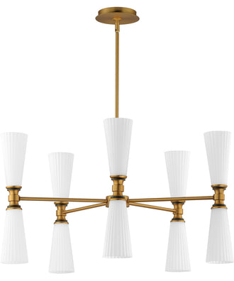 The Krevat 10-Light Chandelier in Black and Natural Aged Brass is a stunning addition to any home. This chandelier features fluted Satin White glass shades that flare outward from intricate and thin arms, creating a sophisticated and modern look. The contrasting finishes of Natural Aged Brass and Matte Black add character and depth to the design, making it a versatile piece that can easily transition between modern and traditional spaces.