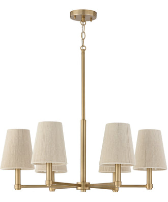 The Mira 6-Light Chandelier in Matte Brass is a stunning blend of classic elegance and organic charm. Its sleek, simple silhouette is enhanced by a light, honey-toned gold finish that adds a touch of sophistication to any space. The chandelier features six arms extending from a central column, each adorned with a Bleached Natural Rope shade. These shades add a soft dimension and a hint of rustic appeal, creating a perfect balance between modern design and timeless beauty.