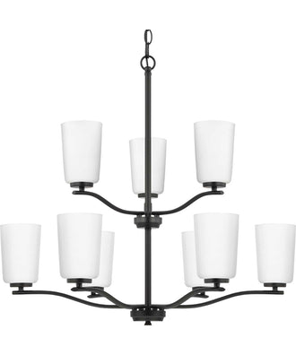 The Adley Collection chandelier is a simple, elegant fixture that is perfect over halls and home theaters, dining rooms or great rooms. The light's form is fundamentally modern but with a traditional twist, making it ideal for transitional and contemporary interiors. The double-tiered chandelier is coated in a stately matte black finish. The clean design combines etched white glass shades with a curved arms and simple, straight bars. Uses (9) 60-Watt maximum, medium base bulbs or LED equivalent, that is sold separately, and dimmable when used in conjunction with a dimmable bulb. Measures 28-in. diameter by 26.12-in. height. Includes 60 in. of chain for a variety of ceiling heights and can be used on a sloped ceiling. Warranty: Our 1-Year Limited Warranty guarantees your complete satisfaction with your purchase and includes professional after-sales customer service support. Includes installation instructions and mounting hardware for a quick, easy installation. Progress Lighting products are designed for exceptional quality, reliability, and functionality