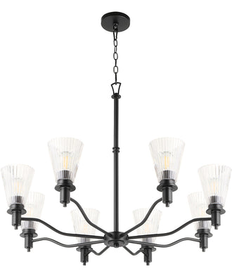 The Lawton 8-light Chandelier in Matte Black is a stunning piece that brings a touch of sophistication to any space. With its sleek, matte black finish, this chandelier exudes a modern yet timeless appeal. The design features eight elegantly curved arms that extend outwards, each holding a clear shade that beautifully diffuses the light. The combination of the matte black frame and clear shades creates a striking contrast that enhances the overall aesthetic of the chandelier.
