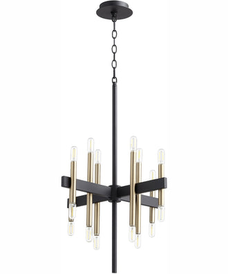 The Luxe 16-light Chandelier in Textured Black with Aged Brass finish by Quorum is a stunning centerpiece that brings a touch of modern elegance to any space. The chandelier's sleek and contemporary design features a striking combination of textured black and aged brass finishes, creating a sophisticated contrast that catches the eye. With its clean lines and minimalist aesthetic, this chandelier seamlessly blends into various interior styles, from modern and contemporary to transitional and industrial themes.