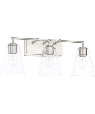 The 3-Light Vanity in Brushed Nickel with Clear Glass is a perfect blend of modern elegance and timeless design. The sleek brushed nickel finish adds a touch of sophistication, while the clear glass shades provide a contemporary flair. This vanity light features three lights, each encased in a beautifully crafted clear glass shade that allows for maximum light output and creates a bright, welcoming ambiance in any room.