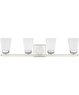 Crafted with meticulous attention to detail, the Baxley 4-Light Vanity boasts a polished nickel finish that not only looks luxurious but is also durable and easy to maintain. The high-quality materials used in its construction ensure longevity and reliability, making it a wise investment for your home. The white glass shades add a touch of elegance and help to evenly distribute light, reducing harsh shadows and providing ample illumination.