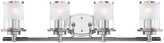 This stunning bath vanity light features a polished chrome finish that exudes a sense of luxury and refinement. The fixture includes four lights, each adorned with a sand and clear shade that beautifully diffuses the light, creating a soft and inviting ambiance. The cylindrical shades are designed to complement the chrome base, resulting in a harmonious and stylish look.