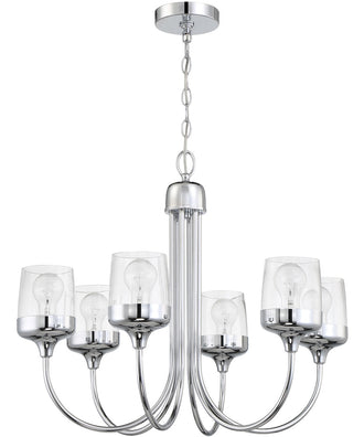 The Wrenn 6-Light Lighting Chrome chandelier from Craftmade epitomizes minimalist elegance with its beautifully sculpted lines and clear glass shades. The chrome finish exudes a sleek, modern vibe, making it an ideal addition to any contemporary or transitional space. The chandelier's design is both timeless and versatile, ensuring it complements a wide range of interior styles.