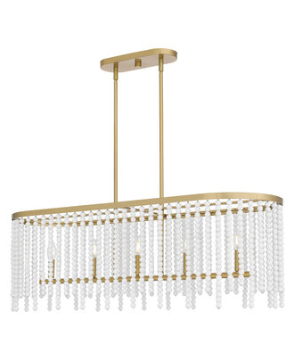 The Apelle Medium 5-light Island Light in Aged Brass is a stunning piece that brings a touch of glamour to any space. Its playful yet sophisticated design features an array of white glass beads that cascade gracefully, creating a visually captivating effect. The aged brass finish adds warmth and elegance, making it a perfect centerpiece for various room settings.