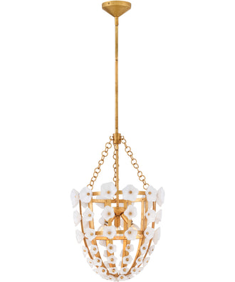 The distressed brass frame beautifully complements the clear and white glass blossoms, creating a warm and inviting ambiance. The brass finish has been carefully distressed to give it a timeless, antique appearance that adds character and elegance to your space. The combination of brass and glass creates a harmonious balance between classic and contemporary design elements.