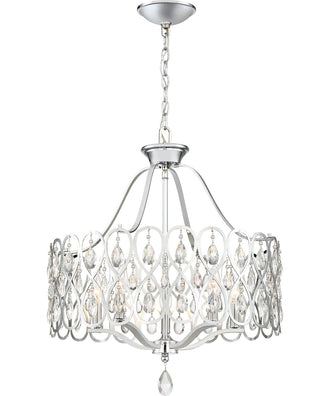 The Lulu 5-light Chandelier in Polished Chrome is a stunning centerpiece that epitomizes opulence and sophistication. Featuring an ornate outer cage adorned with faceted glass prisms, this chandelier is designed to catch the eye and elevate any room's aesthetic. The polished chrome finish adds a contemporary touch, making it a versatile piece that complements various interior styles. The intricate design ensures that each of the five candelabra bulbs inside casts a luminous glow, refracting light through the crystals for a dazzling effect.