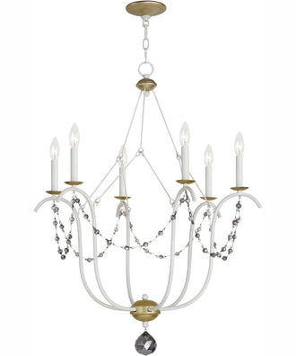 The Formosa 6-Light Chandelier in Ecru and Venetian Gold is a stunning statement piece that draws inspiration from regal agrarian manors. This chandelier is designed with operatic proportions, making it an eye-catching addition to any room. The bottom assembly features gracefully swollen curves, hand-painted in a sophisticated Ecru White finish, complemented by the luxurious Venetian Gold accents. This combination of finishes not only adds depth and dimension but also enhances the overall elegance of the piece.