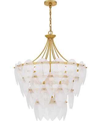 The Quoizel Pendant showcases an exquisite design with its cascading layers of leaf-shaped glass panels. Each panel is meticulously crafted to create a harmonious blend of traditional and contemporary styles. The gold leaf finish enhances the overall aesthetic, providing a warm and inviting glow. The pendant's steel base material ensures durability and longevity, making it a timeless addition to your home decor.