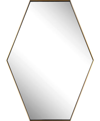 This hexagon mirror features a contemporary style using a stainless steel frame finished in a plated brushed brass, surrounding a floating style polished edge mirror. may be hung horizontal or vertical.