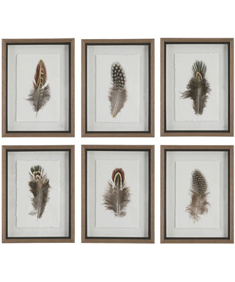 This set of feather artwork adds natural charm to a design. each exclusive print highlights a different flying species in various brown, cream, and charcoal tones on textured art paper. in addition to hand torn deckled edge detailing, each piece is framed shadowbox style against a textured paper backing with a rustic wood tone frame and distressed black liner under glass.