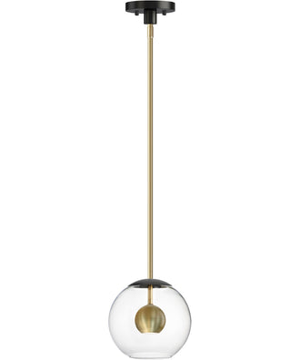 The Nucleus 10 inch LED Pendant in Black and Natural Aged Brass is a stunning addition to any modern or contemporary space. This pendant light features a sleek design with a clear glass orb that beautifully showcases a small aluminum sphere within. The combination of black and satin brass finishes provides a striking contrast, adding a touch of sophistication and elegance to your decor.