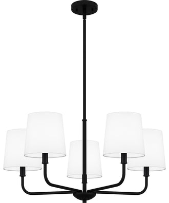 The Gallagher 5-light Chandelier in Matte Black is the epitome of modern elegance. Its sleek, minimalist design features a matte black finish that exudes sophistication and contemporary charm. The chandelier's five arms extend gracefully, each supporting a pristine white fabric shade that adds a touch of softness and warmth to the overall look. This combination of matte black and white creates a striking contrast, making it an eye-catching centerpiece in any room.
