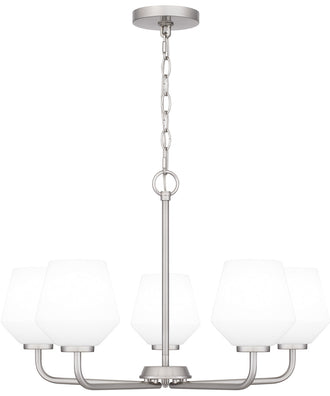 The Nielson 5-light Chandelier in Brushed Nickel is the epitome of transitional styling, merging clean lines with a touch of sophistication. The chandelier features five opal etched glass shades that provide a soft, diffused light, creating a warm and inviting ambiance in any room. The brushed nickel finish adds a modern touch, making it a versatile piece that complements various décor styles, from contemporary to traditional.