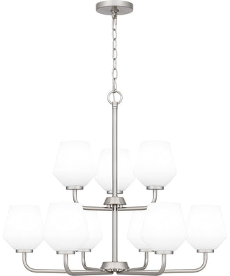 The Nielson 9-light Chandelier in Brushed Nickel is a stunning addition to any home decor, offering a perfect blend of transitional styling and clean lines. This chandelier features nine beautifully crafted opal etched glass shades that provide a soft and inviting glow. The brushed nickel finish adds a touch of sophistication and modernity, making it a versatile piece that complements various interior themes.