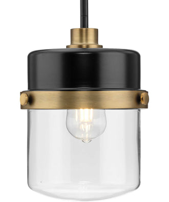 The Beckner Pendant's design is a harmonious blend of industrial and mid-century aesthetics. Its mechanical knobs and hooded frame reflect a vintage appeal, while the matte black finish and vintage brass accents provide a contemporary twist. The clear glass shade, shaped like a bowl, enhances the light's brightness and adds an elegant touch to the overall design.