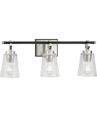 The Cassell Three-Light Vanity Fixture brings an enduring style to the bath. The light boasts a dual-tone finish of Brushed Nickel and Matte Black that accentuates its distinguished and handsome design. Tailored details smoothly blend linear precision with elegant circular rings and clear glass shades.