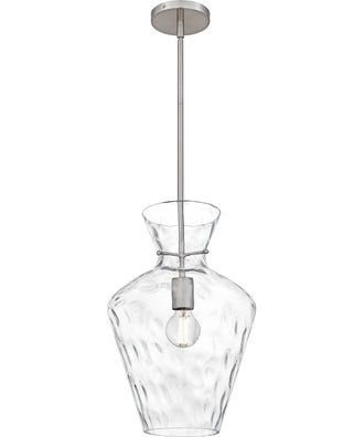 The Drover 1-Light 12"W Brushed Nickel Pendant Ceiling Light is a perfect blend of simplicity and style, designed to elevate any space with its transitional charm. The fixture features a brushed nickel finish that exudes modern elegance while maintaining a timeless appeal. The clear water glass shade adds a touch of texture and sophistication, creating a beautiful diffused light that enhances the ambiance of any room.