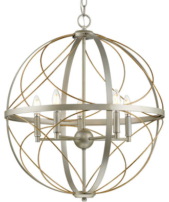 An interlocking sphere with carefully crafted decorative details manifests a whimsical and romantic pendant. The elegant, silver ridge frame captures a tasteful, timeless look with hand-painted accents. The frame's open-cage design is perfect for creating an airy, romanticized glow. Ideal for any foyer, kitchen, or dining room. Perfect for transitional, new traditional, and farmhouse settings. Measures 22-inch width by 26-inch height. Uses five candelabra base bulbs that are sold separately (60w max - LED or incandescent). Able to be fully dimmable with dimmable bulbs. Includes installation instructions and mounting hardware. Progress Lighting products are designed for exceptional quality, reliability, and functionality.