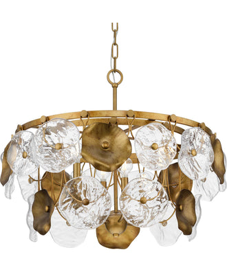 The Loretta 6-Light Transitional Chandelier in Gold Ombre embodies a harmonious blend of modern organic, transitional, and luxe designs. Its unique shape and intricate detailing capture the serene essence of lily pads floating on a gently rippling pond. This chandelier features gleaming clear glass and textured metal leaves, finished in a sophisticated Gold Ombre patina, offering an artistic yet refined touch to any space.