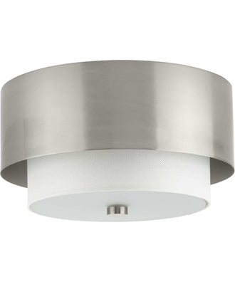 The Silva Collection flush mount is a simple, elegant fixture that is perfect for halls and foyers, bedrooms and living rooms. The fixture's sophisticated design elevates contemporary and luxe industrial settings. The flush mount is coated in a subtle brushed nickel finish. A concentric metallic band surrounds a crisp white linen shade. Soft ambient light is delivered to the room through the fabric shade and etched glass diffuser. Uses (2) 15-Watt maximum, medium base LED bulbs, that are sold separately, and dimmable when used in conjunction with a dimmable bulb. Measures 14-in. diameter by 7.87-in. height. Certifications: cCSAus Damp Location listed, fixture can be used in rooms where moisture may be present. Warranty: Our 1-Year Limited Warranty guarantees your complete satisfaction with your purchase and includes professional after-sales customer service support. Includes installation instructions and mounting hardware for a quick, easy installation. Progress Lighting products are designed for exceptional quality, reliability, and functionality