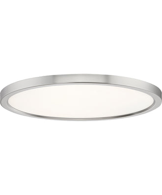 Available in four finishes and four sizes, the Outskirts flush mount is suited for a variety of room applications. In your choice of Earth Black, Brushed Nickel, White or Oil-rubbed Bronze, it is featured in sizes of 7.5”, 11”, 15”, or 20". The white acrylic shade is illuminated with integrated LED technology and the thick canopy adds depth to the simple structure.