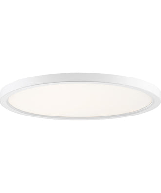Available in four finishes and four sizes, the Outskirts flush mount is suited for a variety of room applications. In your choice of Earth Black, Brushed Nickel, White or Oil-rubbed Bronze, it is featured in sizes of 7.5”, 11”, 15”, or 20". The white acrylic shade is illuminated with integrated LED technology and the thick canopy adds depth to the simple structure.