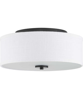 Gives a dash of flair to the standard ceiling light. Summer Linen shade with an etched glass diffuser gives a beautiful glow of light. Close-to-ceiling lights like this two-light flush mount are natural choices for bathrooms, closets, hallways, and small rooms. Fits seamlessly within Modern, Traditional and Farmhouse interiors. Dramatic Graphite finish. Measured 13in diameter x 10 1/8in ht. Uses two 60-watt max. medium base lamps or LED equivalent (sold separately). UL Safety listed for use in damp locations. Compatible with standard wall dimmer. Progress Lighting products are designed for exceptional quality, reliability, and functionality. Includes installation instructions and mounting hardware. Coordinating fixtures available