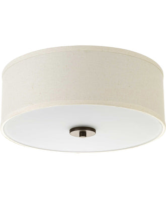 Harkening back to a simpler time, the Inspire Collection freshens traditional forms with flowing lines. The two-light Antique Bronze flush mount Inspire features an etched glass diffuser with an off-white linen shade.