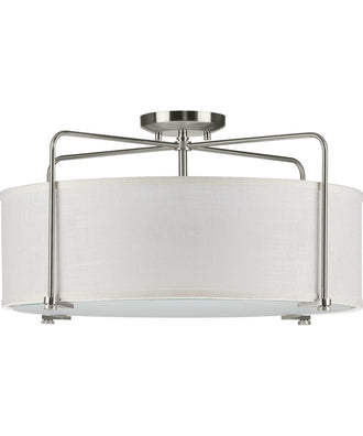 Perfect as a statement ceiling fixture or as a pendant hanging in multiples of two or more over a dining table or kitchen island. Simple, stylish, semi-flush convertible with a metal, curved-corner frame that captures the textured linen shade within its arms. The updated classic styling is ideal for transitional and farmhouse interiors. Textured linen shade glows from the inside out. Finished in quietly reflective Brushed Nickel with a crisp, Summer Linen shade. The diffuser elegantly hides the lightbulbs while providing soft, comfortable light. Uses three 60-watt max medium base bulbs, or the LED equivalents, that are sold separately. Hanging and ceiling mount hardware are included. Measures 21-3/4 in diameter X 11 in height, overall height with stem 76 in, wire 120 in. Progress Lighting products are designed for exceptional quality, reliability, and functionality
