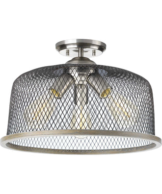 Rustic and vintage decor is a popular trend that can transform a home into a nostalgic retreat. Tilley features warehouse style shades formed from metal mesh. Three light semi flush fixture. Popular Brushed Nickel finish. A hand painted, faux wooden rim evokes an artful, yet industrial, style. Uses three 60-watt max. medium base bulbs (sold separately). A natural choice for closets, hallways and smaller areas within the home. Versatile fixture ideal for rustic farmhouse, modern farmhouse, urban industrial and coastal interiors.
