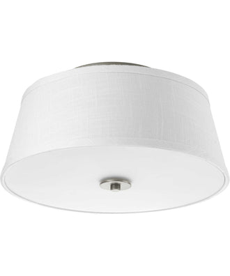 The two-light flush mount from the Arden collection offers a comfortable silhouette that is both rustic and modern. The summer linen shades with etched glass diffuser coordinates with many other Progress Lighting styles like Cherish. This transitional style fixture is finished in Brushed Nickel.