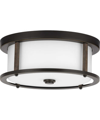 Great for bathrooms, living rooms, hallways, bedrooms, or wherever soothing overhead lighting is desired. The incorporation of faux wood accents offers a natural and organized feel for coastal and modern farmhouse interiors. Two-light flush mount with a simple, clean design. Features a signature, oversized frame banded on its top and bottom. Trimmed in metal with faux wood accents. An etched glass shade fully encloses the bulb. Finished in Antique Bronze. Measures 13 in diameter X 5-1/4 in height. Uses two 60-watt max medium base bulbs, or the LED equivalents, that are sold separately. Progress Lighting products are designed for exceptional quality, reliability, and functionality