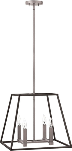 The 18" W Fulton 4-Light Foyer Chandelier in Aged Zinc is a perfect blend of minimalist beauty and vintage industrial style. The clean, airy tapered cage design emphasizes the 'less is more' philosophy, making it an ideal addition to any modern or industrial-themed space. Constructed without glass, this chandelier features unique square candle sleeves that rest on a discreet “H”-shaped cluster, adding a touch of sophistication to its overall look.