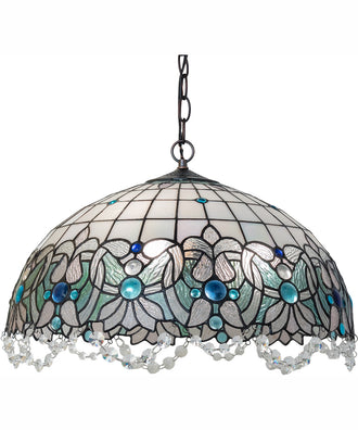 The color palette of the Angelica Pendant is a harmonious blend of blues, whites, and clear accents. The iridescent blue jewels catch the light beautifully, creating a captivating display of colors. The white art glass background provides a clean and elegant canvas for the intricate motifs. The mahogany bronze finish on the hardware complements the overall design, adding a touch of warmth and richness to the piece.