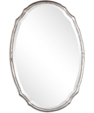 This oval shaped, silver frame, is made of hammered metal and features a concave surface. The mirror has a generous 1.25" bevel. May be hung either vertically or horizontally. Also available in charcoal, W00526, and gold leaf, W00527.