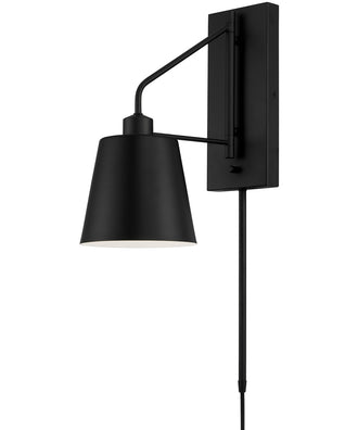 Spotlight distinct style with the Alden Sconce. The Matte Black finish with White interior delivers a sleek contrast, and the crisp, tapered metal shade swings from side to side and includes a dimmer switch bringing modern task lighting where you need it most. This versatile fixture includes a 12 cord cover and plug-in option.