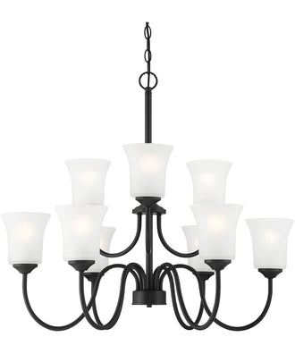 The Bronson 9 Light Chandelier in Matte Black is a stunning centerpiece that effortlessly combines traditional and modern aesthetics. Its sleek matte black finish complements nearly any decor, making it an incredibly versatile piece. The chandelier features flared frosted glass shades that add a touch of elegance while providing soft, diffuse light. The design is both simple and sophisticated, with gracefully curved arms that create a balanced and harmonious look.