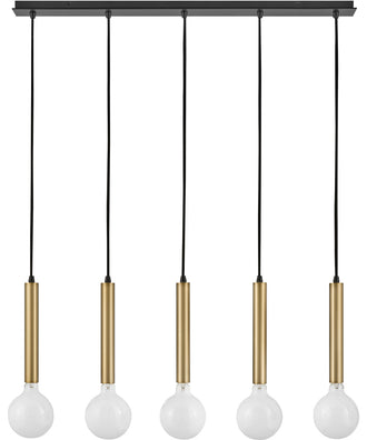 The Bobbie chandelier features a sleek and sophisticated design that seamlessly integrates mid-century modern elements with a playful, contemporary vibe. The chandelier showcases five lights suspended from a linear canopy, each light encased in a gleaming lacquered brass finish. The bold contrast between the lacquered brass and the intense black cords creates a striking visual appeal that draws the eye and adds a touch of luxury to any space.