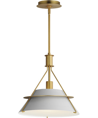 The Lucas 1-Light Pendant features a sleek and contemporary design, characterized by its Light French Gray metal shade suspended from a halo of Natural Aged Brass. The combination of these two finishes creates a visually appealing contrast that enhances the overall aesthetic of the fixture. The shade’s interior is painted white to maximize light output, while the top is left open, casting light both upwards and downwards, creating a warm and inviting ambiance.