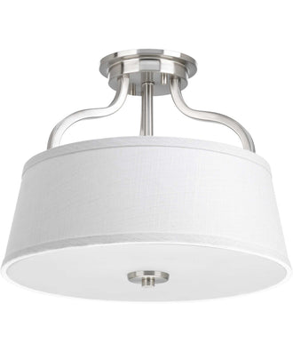The two-light semi-flush convertible fixture from the Arden collection offers a comfortable silhouette that is both rustic and modern. The summer linen shades with etched glass diffuser coordinates with many other Progress Lighting styles like Cherish. This fixture can be mounted as a semi-flush or chain hung. This transitional style fixture is finished in Brushed Nickel.