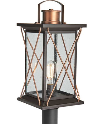 Transform your home into a warm and cozy dream with the friendly farmhouse-style of this post lantern. A rustic X-brace design decorates each side of the charming lantern silhouette. Clear seeded glass panes add an extra pop of rustic personality. An antique bronze finish complemented with antique copper accents adds warmth and character as the lantern infuses your home with gentle illumination.