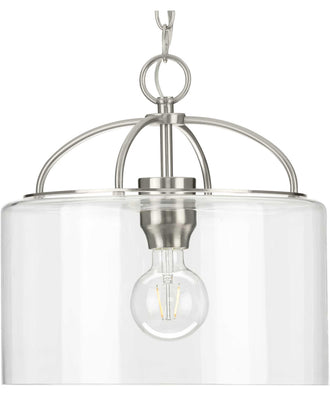 Enhance your home with the Leyden 1-Light Clear Glass Farmhouse Style Hanging Pendant Light in Brushed Nickel. This exquisite lighting fixture is designed to bring a touch of elegance and sophistication to any space. Featuring a gently curving arm and light base coated in a beautiful brushed nickel finish, this pendant light exudes a timeless charm that complements various interior styles.