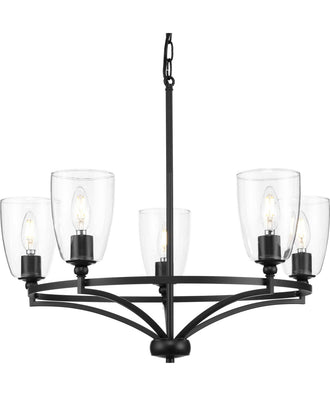 The Parkhurst 5-Light New Traditional Clear Glass Chandelier Light in Matte Black is the epitome of elegance and sophistication. Its graceful curves and bold angles come together to create a softly structured look that adds a touch of class to any room. The chandelier's airy frame allows for unobstructed layers of light, making it an ideal centerpiece for new traditional, modern farmhouse, and transitional interiors.