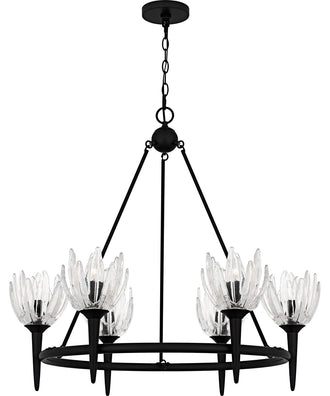 The Shea 6-light Chandelier in Matte Black is a stunning piece that combines traditional style with artistic elegance. This chandelier features handmade glass shades that resemble delicate flower petals, adding a touch of nature-inspired beauty to your home. The matte black finish provides a sophisticated contrast to the clear glass shades, creating a striking visual appeal. Each piece in the Shea collection is unique due to the handmade nature of the glass, ensuring that your chandelier will have its own distinct character.