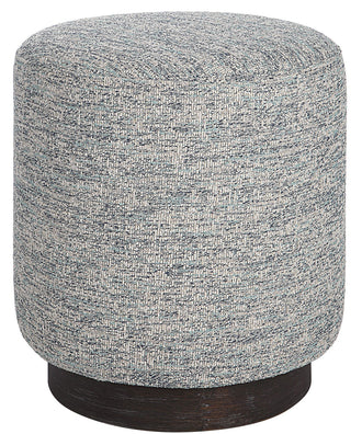 This plush ottoman is covered in a casual blue and white tweed fabric with a dark walnut stained oak base. versatile and stylish, this piece can be used as a seat or footrest, grouped together or as a singular accent piece.