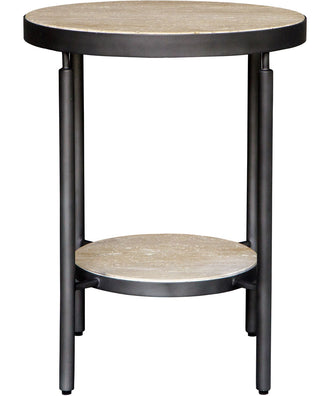 • Features: Perfect for contemporary or industrial interiors the dauntless side table features two beautiful honed and unfilled travertine shelves suspended by a matte black metal frame. true to the nature of natural materials, each piece will have unique marbling and veining throughout.